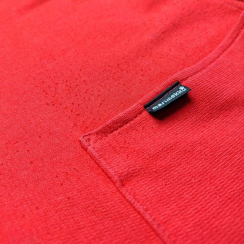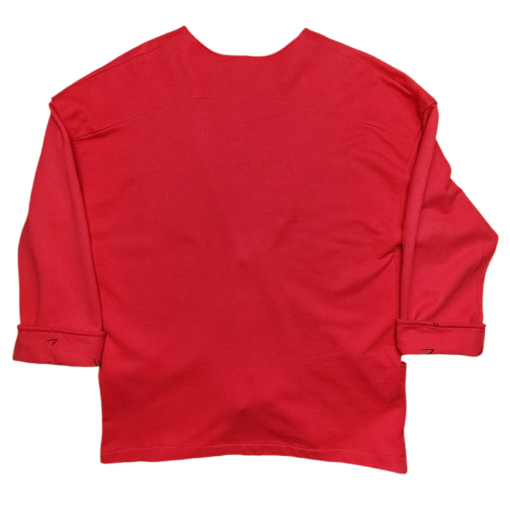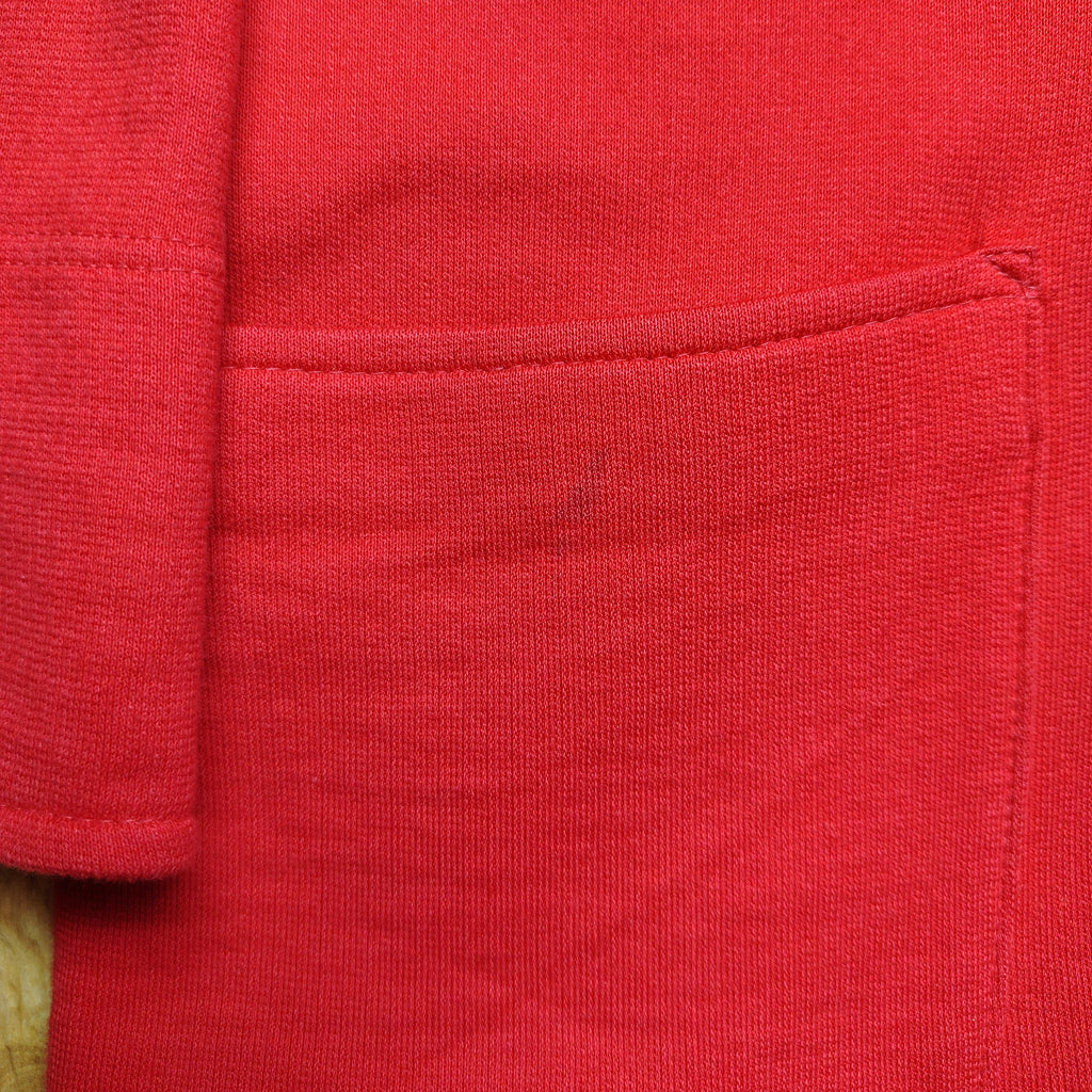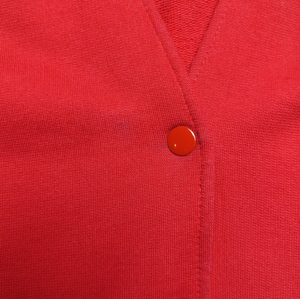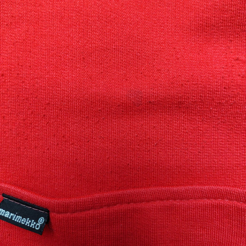 Punainen vintage Marimekon trikoojakku. Edessä painonapit sekä pienet taskut. Nurjalla alavarassa ja hihansuiden käänteessä musta abstrakti kuviointi.