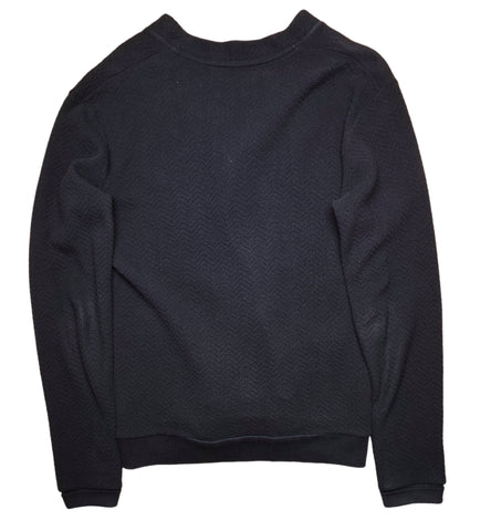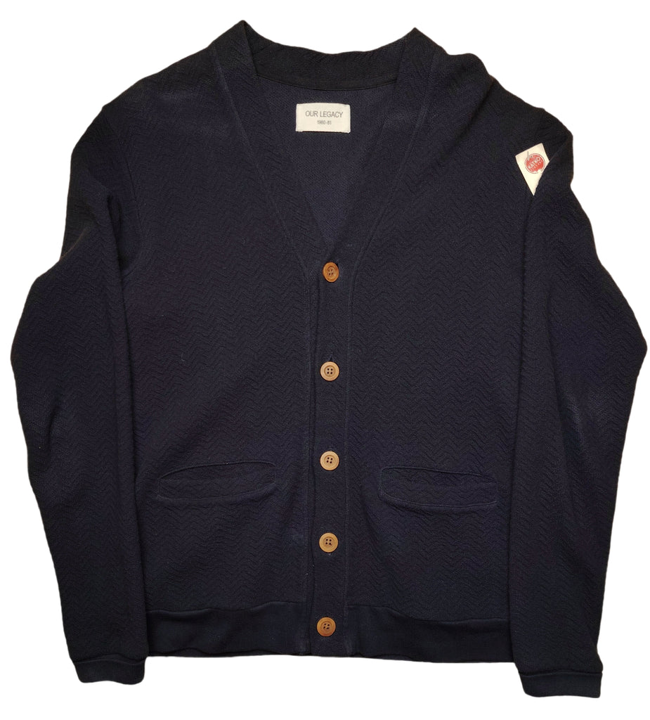 Our Legacy -merkin tummansininen puuvillainen neuletakki. Nappikiinnitys. Edessä pienet taskut. Hihansuissa ja helmassa resori.