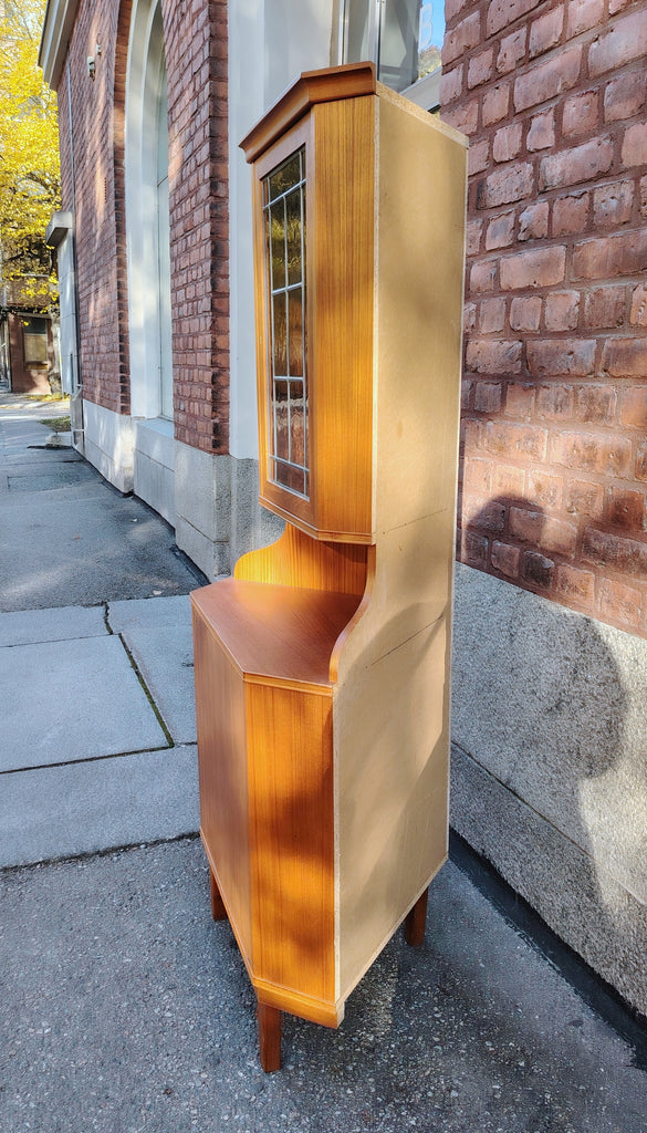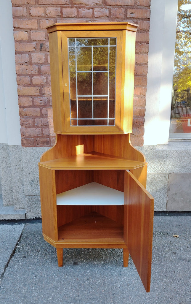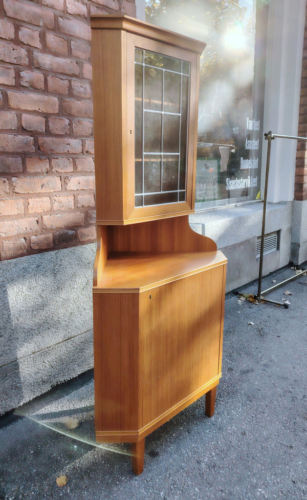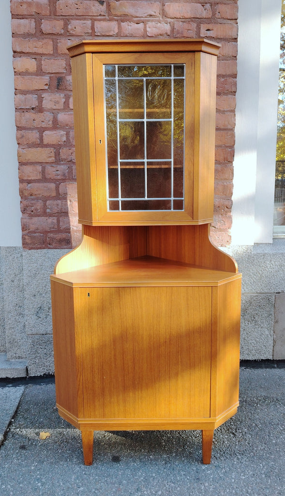 Kaunis vanha teakviiluinen kulmakaappi. Sisällä paljon hyvää säilytystilaa kodin tavaroille.