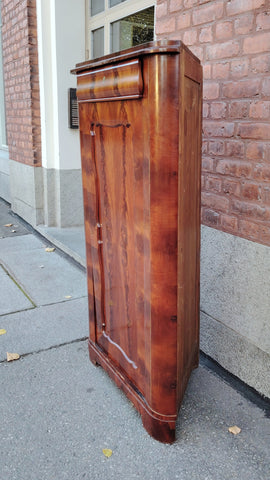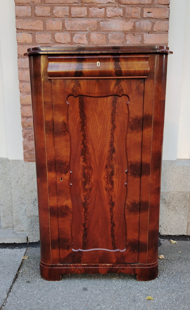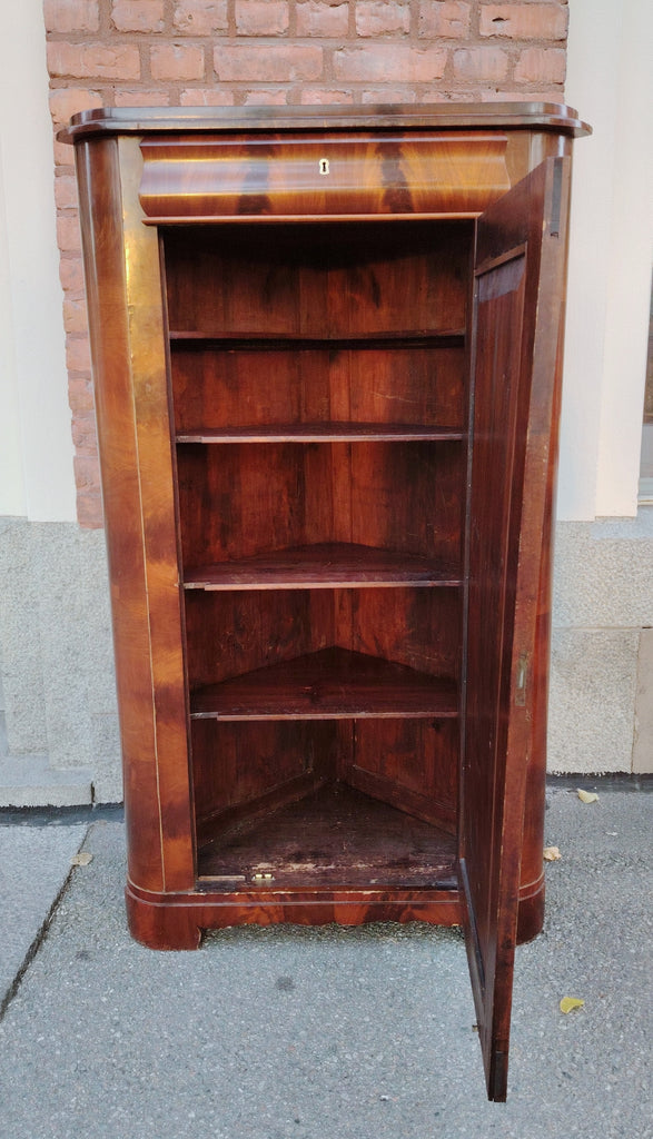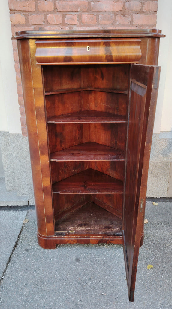 Elegantti puinen kulmakaappi noin 1800/1900-lukujen taitteesta. Kaapin kauniisti pyöristetyt etukulmat ja hieman ulkoneva kansi luovat kaapille ylvään ja katseen vangitsevan ilmeen. Mahonkinen punaruskea puupinta ja symmetrinen puunsyynkuvio korostavat kaapin luonnollista kauneutta. Yläosassa oleva pieni lukollinen laatikko lisää käytännöllisyyttä.