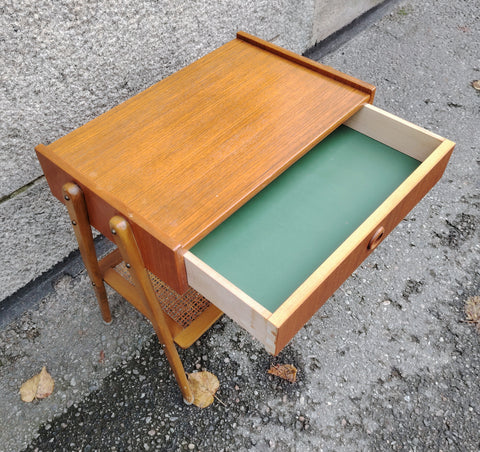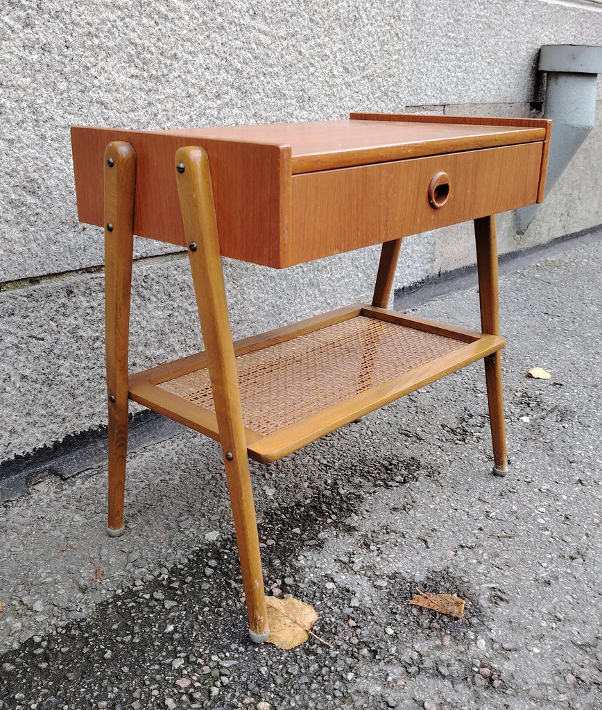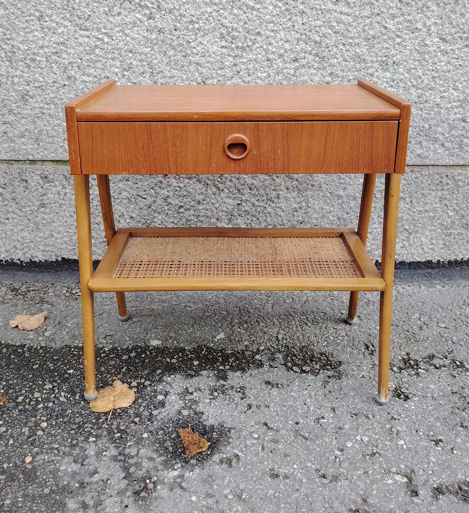 Pelkistetyn kaunis tiikkiviiluinen pieni pöytä vetolaatikolla ja välitasolla.