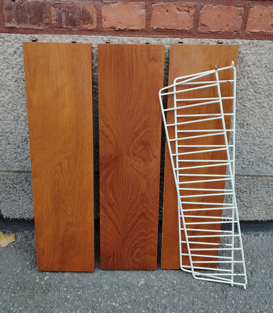 String -seinähylly kolmella hyllyllä ja valkoisilla kannattimilla.