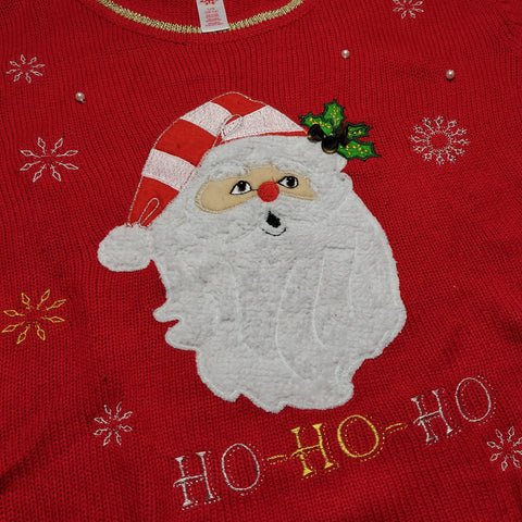 Söpö punainen neule jouluaiheisella brodeerauksella.