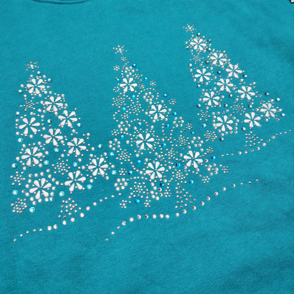 Turkoosi collegepaita. Etupuolella on kolme joulukuusta, jotka on muodostettu osittain kimaltelevilla strasseilla. Pääntiellä tuplaresori.