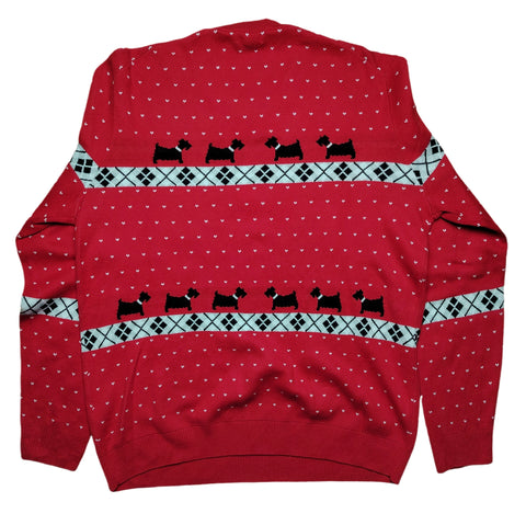 Punainen collegepaita. Paitaa kiertää söötit pienet mustat koirat.