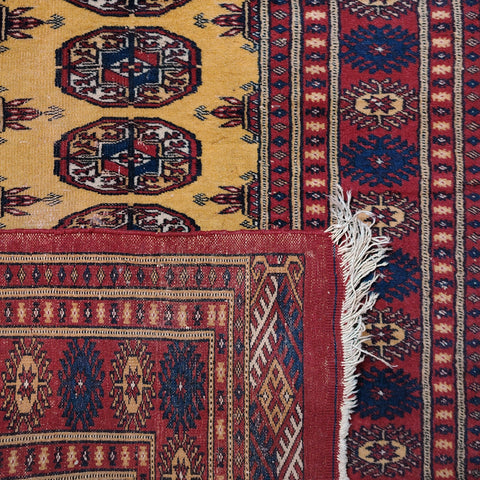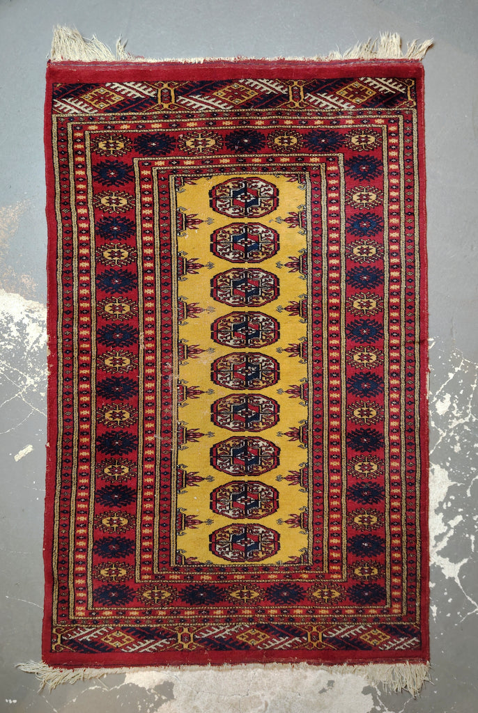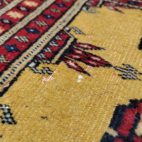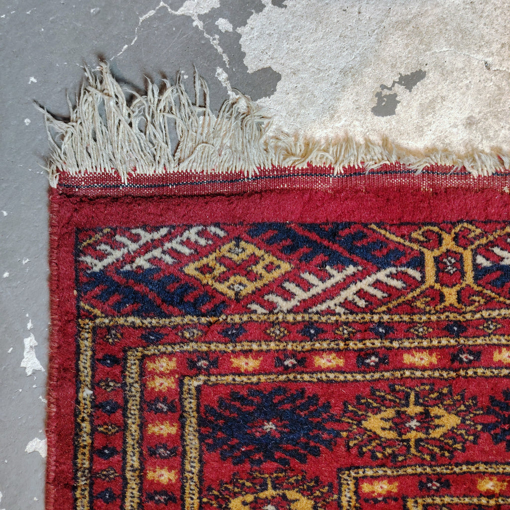 Kunto tyydyttävä. Pinnassa paikoitellen kulumaa. Päätyhapsut kuluneet.