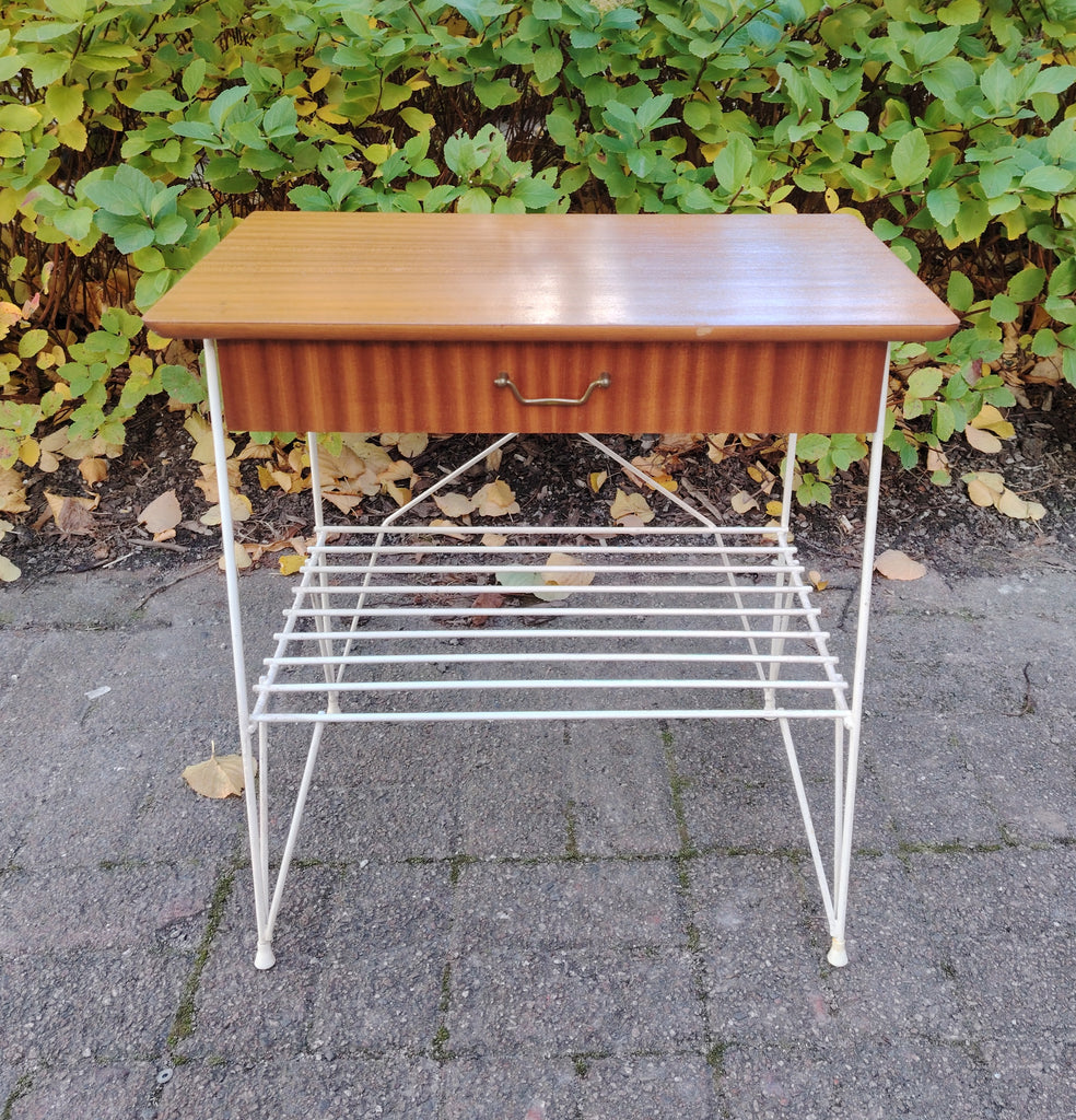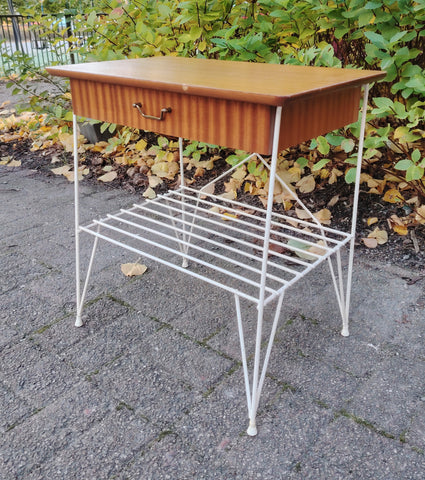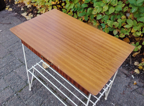 Soma pieni tiikkiviiluinen ja string jalkainen pöytä sivu- tai yöpöydäksi. Yksi vetolaatikko ja välitaso.