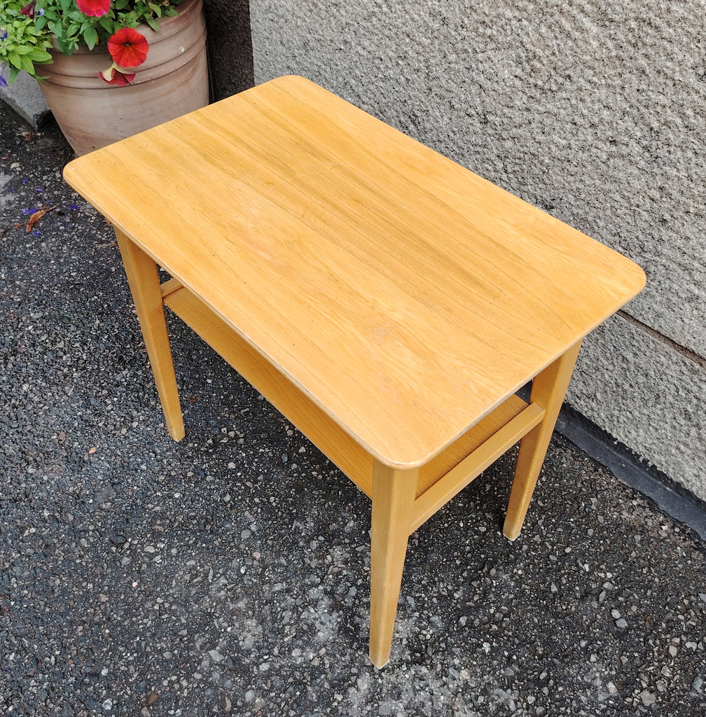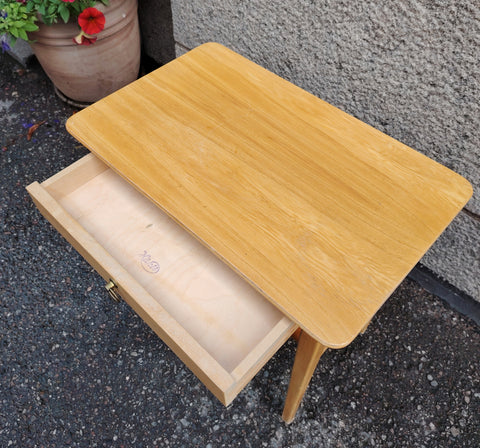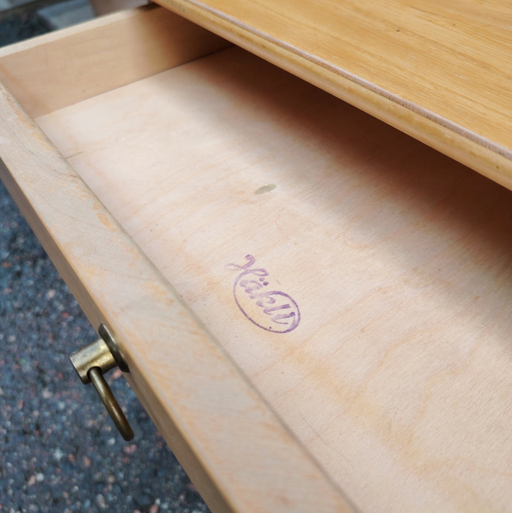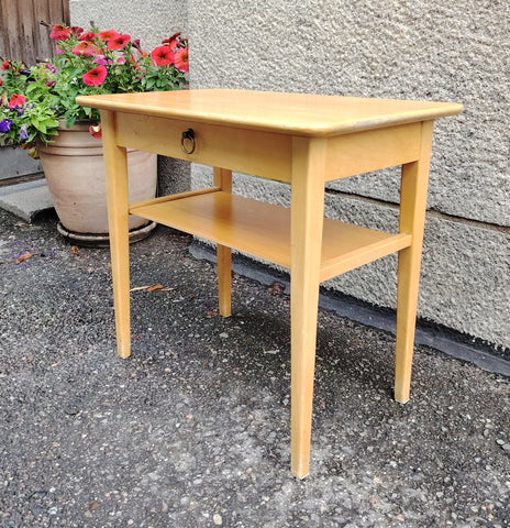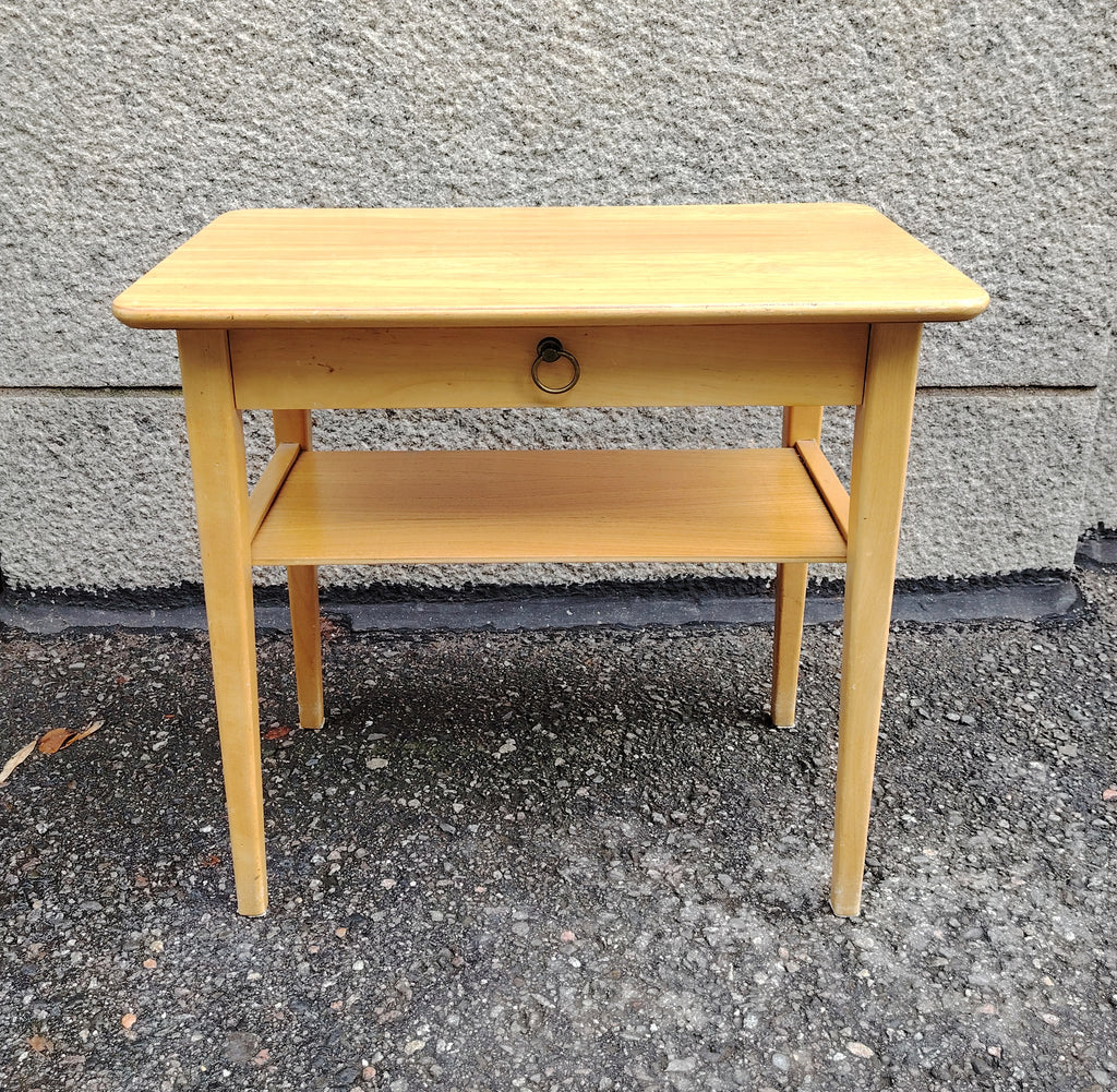 Kevytrakenteinen pieni pöytä, joka sopii täydellisesti yöpöydäksi, sivupöydäksi tai pieneen työtilaan. Pöydässä on yksi vetolaatikko metallisella rengasvetimellä sekä alahylly lisäsäilytystä varten. Selkeälinjainen muotoilu ja luonnollinen puupinta tuovat tilaan raikkautta ja lämpöä. Vetolaatikon pohjassa Häklin leima.