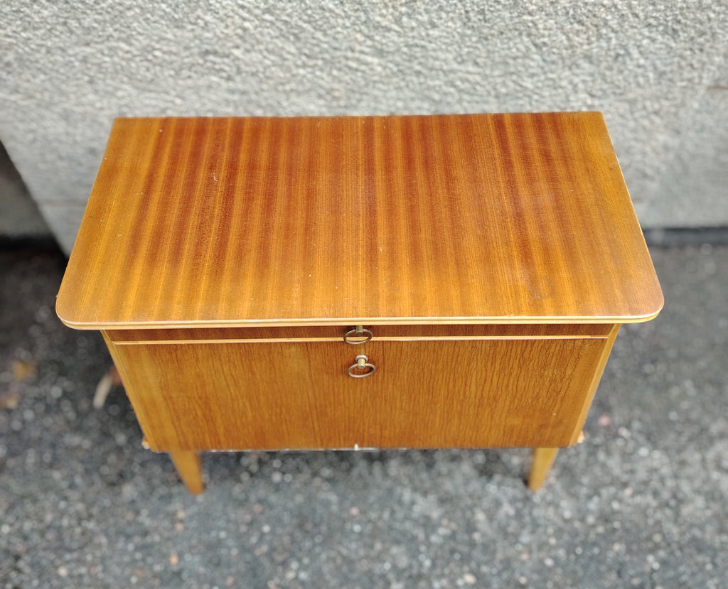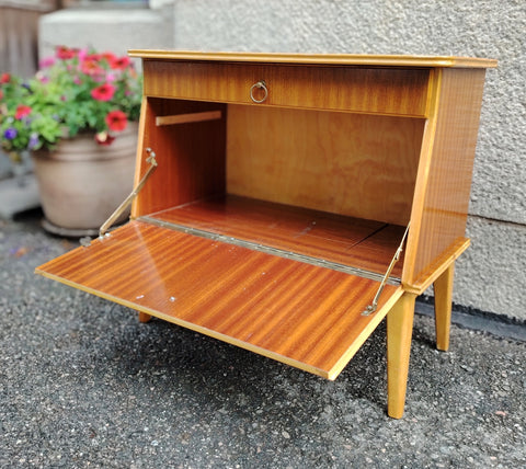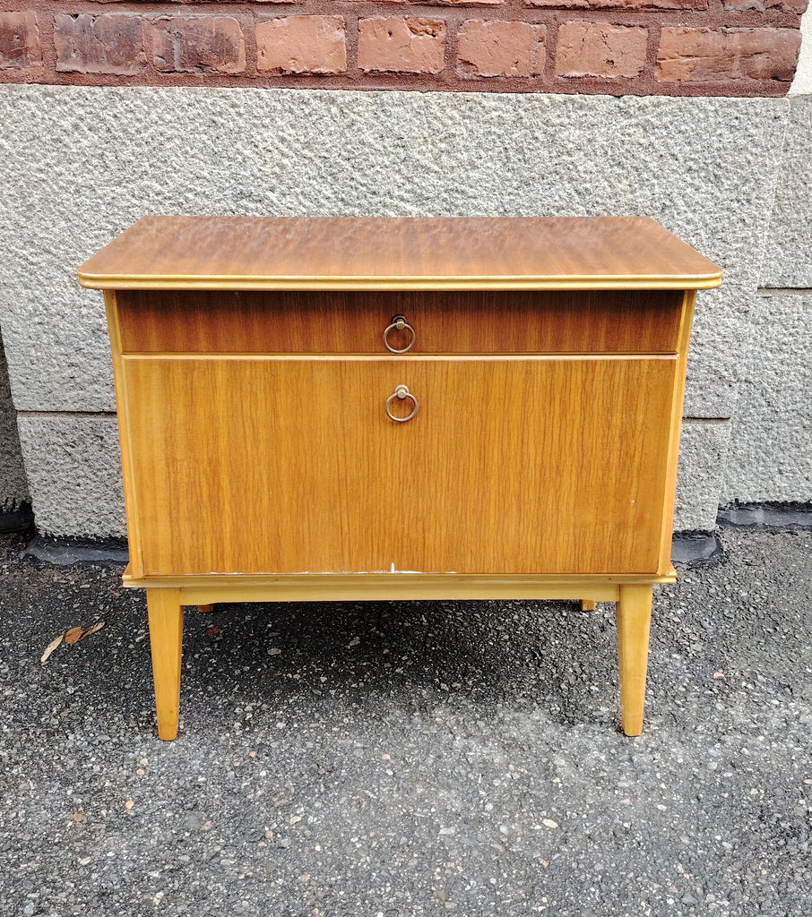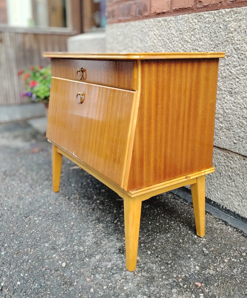 Ihastuttava pieni kaappi tilavalla alakaapilla, jossa alaspäin avautuva klaffiovi sekä yksi vetolaatikko. Metalliset rengasvetimet. Sirot kapenevat jalat ja viisto etupaneeli tekevät tästä kalusteesta todellisen retrohelmen.