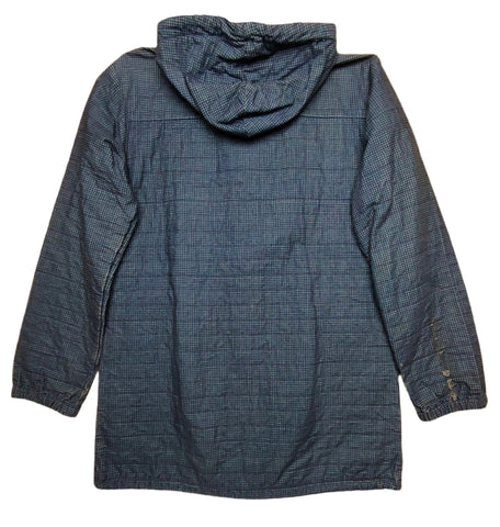70-luvun Marimekon sininen ulkoilutakki. Edessä napit ja sivutaskut. Kiinteä huppu kiristysnyörillä. Helmassa myös kiristysnyöri. Vuorittamaton.