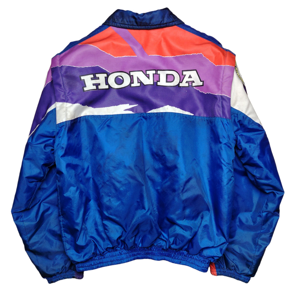 Upea 90-2000-luvun taitteen HONDA ajotakki. Edessä painonepparilista, jonka alla vetoketju. Ei alkuperäistä vetoketjunvedintä. Korvattu metallisella renkaalla. Helmassa ja hihansuissa kuminauhat. Sivutaskut. Kevyesti topattu tikkivuori. Vuorissa yksi povitasku. Takin hihat ovat irrotettavat.