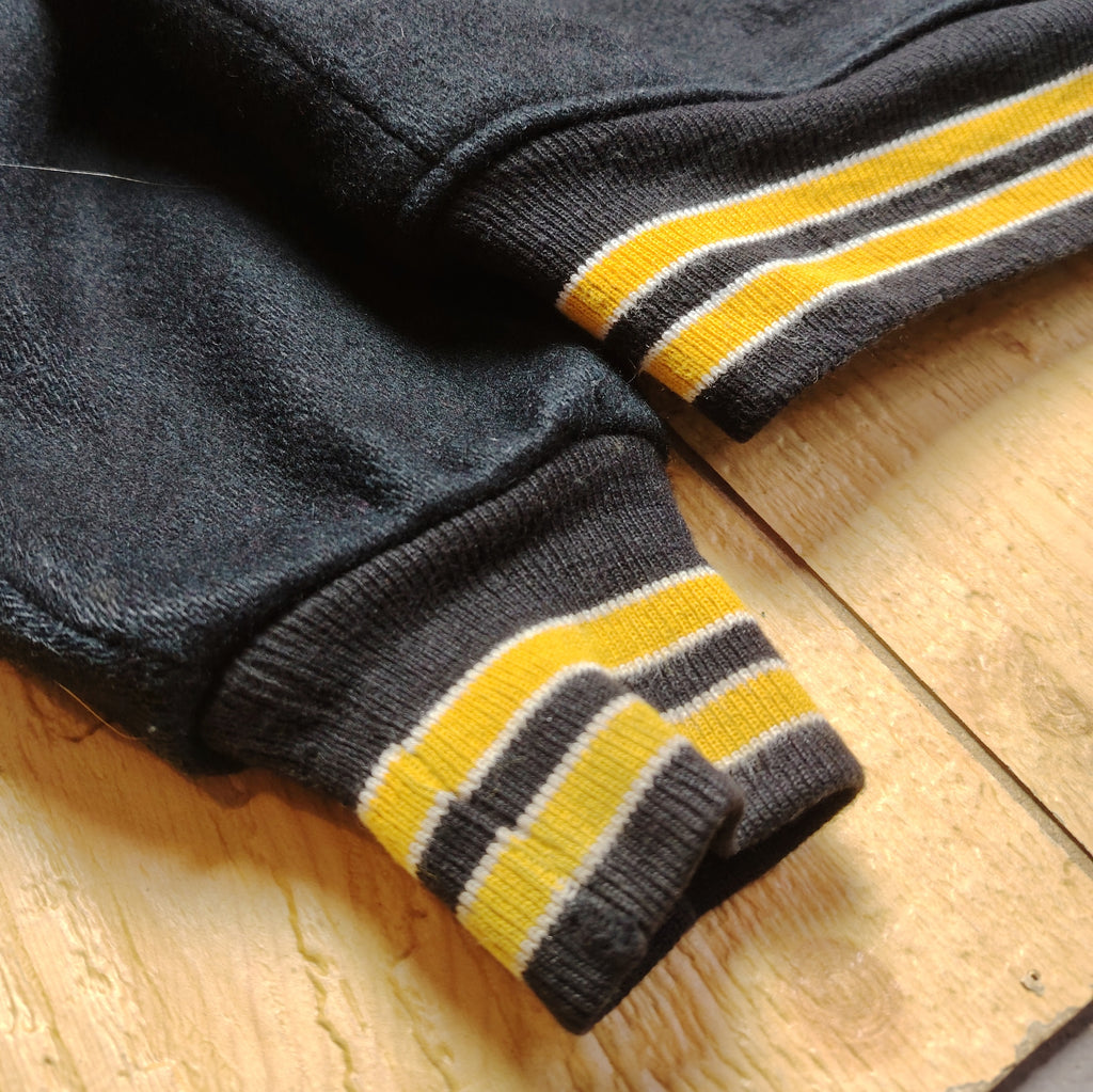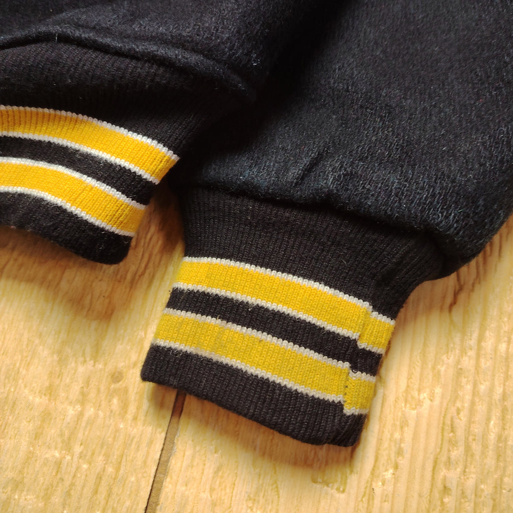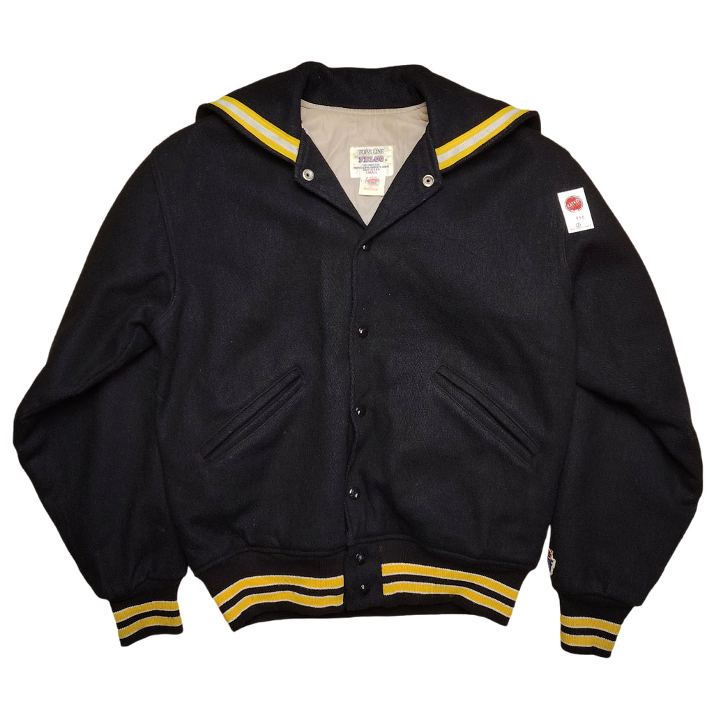Ihastuttava vintage varsitytakki seilorikauluksella. Edessä painonepparikiinnitys sekä sivutaskut. Hihansuissa ja helmassa raidallinen resori.