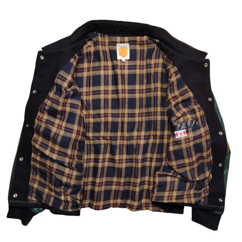 Varsitytakki villasekoitteisella miehustalla ja nahkahihoilla. Edessä painonepparikiinnitys sekä sivutaskut. Vasemmalla puolella rinnassa brodeerattu "The Spirit of Edmonton" logo. Hihansuissa resori. Ohut ruudullinen flanellivuori. Vuorissa povitasku. Leveähkö ja lyhyt malli.