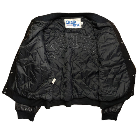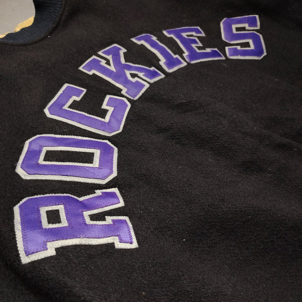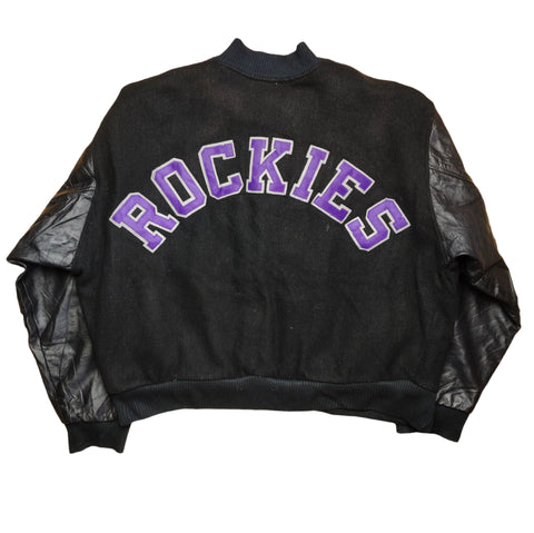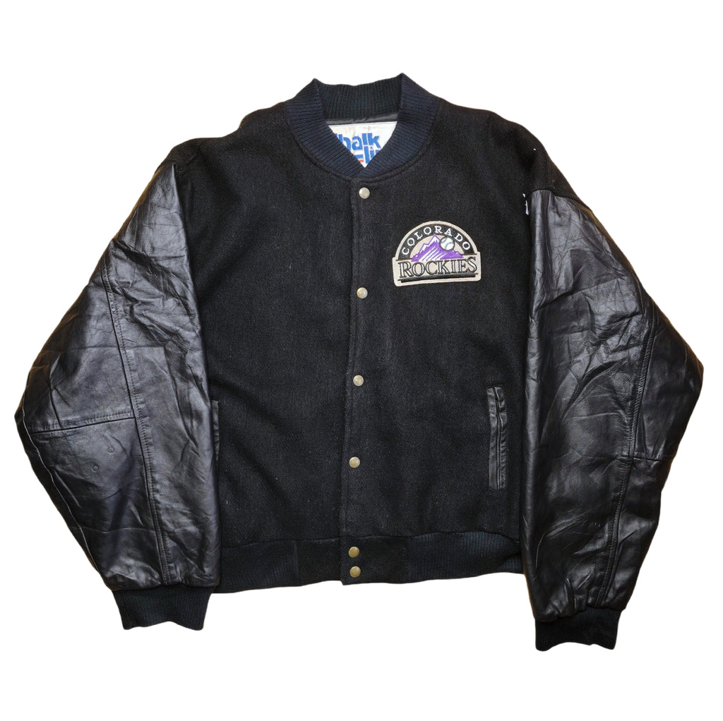 Upea ysäri Chalk Line valmistajan musta varsitytakki villasekoitteisella miehustalla ja nahkaisilla hihoilla. Edessä painonepparikiinnitys sekä sivutaskut. Rinassa vasemmalla puolella hieno COLORADO ROCKIES kangasmerkki. Selän puolella myös upea kirjainmerkein kirjailtu teksti "ROCKIES". Pääntiellä, hihansuissa ja helmassa musta resori. Resoreissa havaittavissa ajan ja käytön tuomaa löystymistä. Kevyesti topattu tikkivuori. Ei povitaskua.