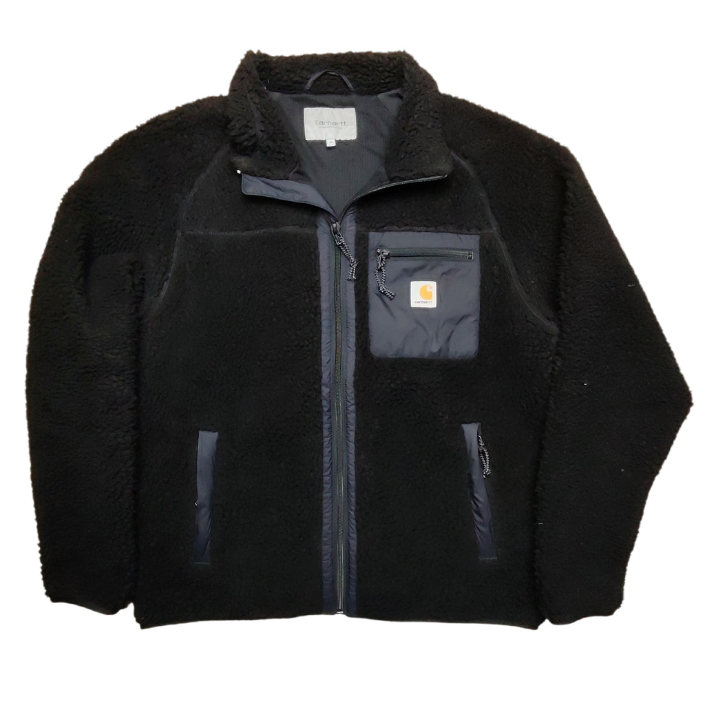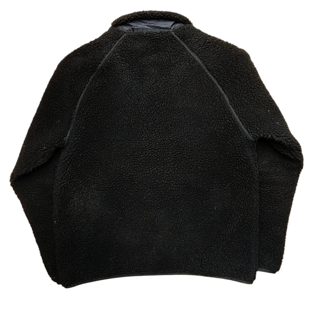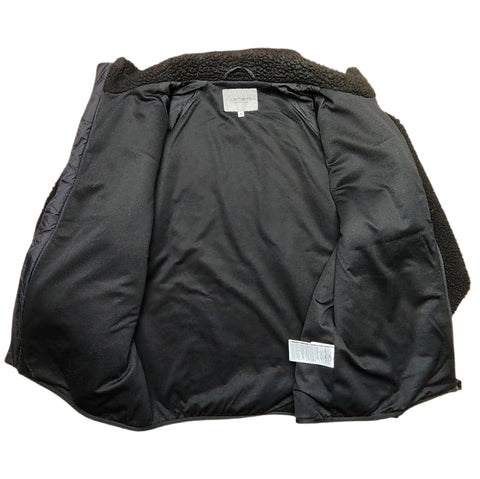 Musta Carhartt Wip -merkin "teddykarva" -takki. Vetoketjukiinnitys. Vetoketjulliset sivutaskut ja rintatasku. Vetoketjuissa heijastavat nyörit. Vuoritettu ohuella verkkokankaalla. Ei povitaskua.