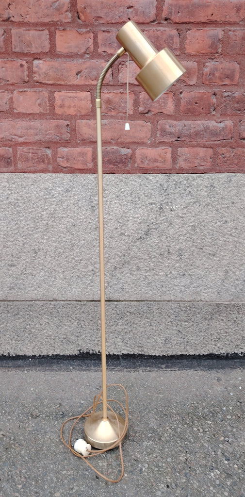 Ihastuttava siro himmeän kultaisen sävyinen metallinen lattiavalaisin. Varjostimen asentoa voi vaihtaa. Vedinkatkaisin. Maadoitettu johto. Toimiva. Jalan metallisen päällisen alla valurautainen jalka.