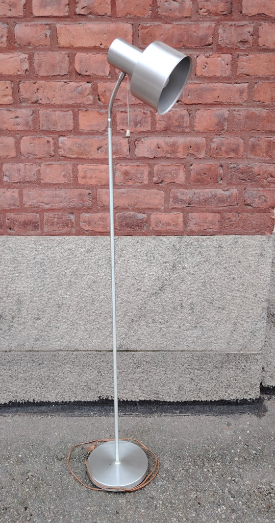 Heleän harmaan sävyinen metallinen lattiavalaisin. Vedinkatkaisin. Maadoittamaton johto. Toimiva. Varjostimen asentoa voi vaihtaa.