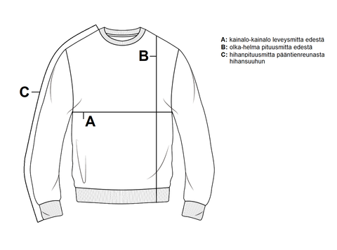Kainalo-kainalo: 51cm Olka-helmapituus: 61cm Hihanpituus pääntienreunasta: 73cm